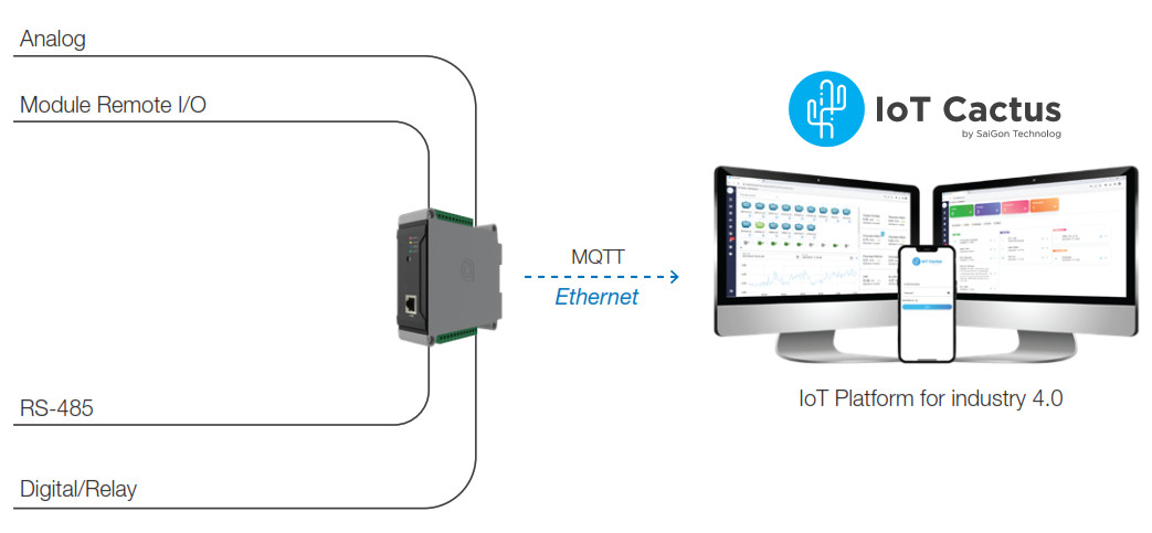 Bộ datalogger M600M-Q-E-N-1 là dòng sản phẩm IoT Gateway được sản xuất và phát triển bởi Saigon Technolog với tính năng kết nối các thiết bị tại hiện trường (bơm, quạt, cảm biến...) bằng các tín hiệu analog, digital, RS-485 và gửi dữ liệu lên Cloud theo giao thức MQTT bằng Ethernet. Cho phép người dùng quản lý, giám sát và điều khiển từ xa trong thời gian thực thông qua nền tảng IoT Cactus trên Web-server, App mobile bằng thiết bị thông minh như điện thoại, laptop, PC, Tablet...