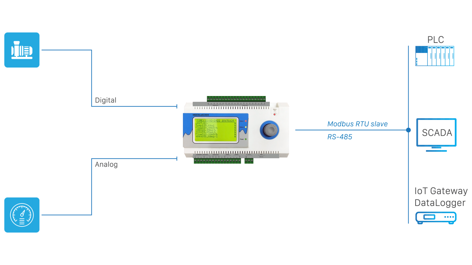 Module I/O M300S-R-R-L chuẩn Modbus RTU với màn hình hiển thị tại chỗ. Nó có khả năng kết nối với các thiết bị tại hiện trường (cảm biên, bơm, quạt, đèn...) bằng các tín hiệu analog, digital và truyền dữ liệu cho các thiết bị ngoại vi (Data logger, Gateway, PLC...) bằng RS-485 theo giao thức ModbusRTU.