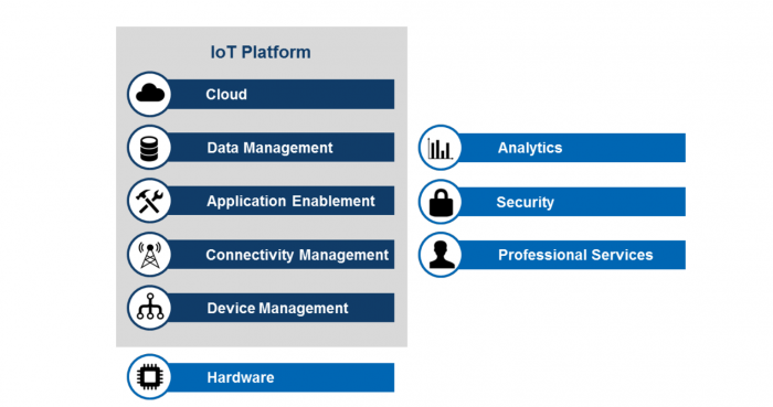 Bằng cách phân tích hàng chục nhà cung cấp thông qua các phương pháp nghiên cứu sơ cấp và thứ cấp, IHS đã phát triển phân loại các chức năng liên quan đến phần mềm bao gồm những gì IHS coi là toàn bộ IoT Platform. Ở cấp độ cao nhất, phân tích này cho thấy rằng một nền tảng phần mềm IoT sẽ kết hợp một số sự kết hợp của năm lĩnh vực chức năng sau đây. Mỗi điều này phải được giải quyết để phát triển, trên tàu, vận hành và quản lý một ứng dụng IoT:
